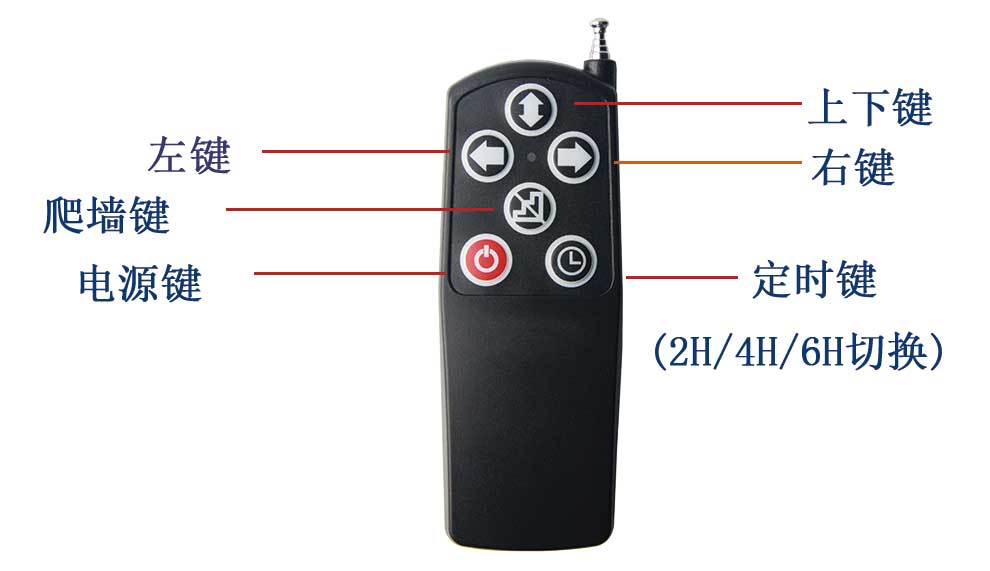 爬墻鍵:按一下不爬墻,再按一下爬墻?。(?使用時建議遙控器距離電控盒不要超過30米)