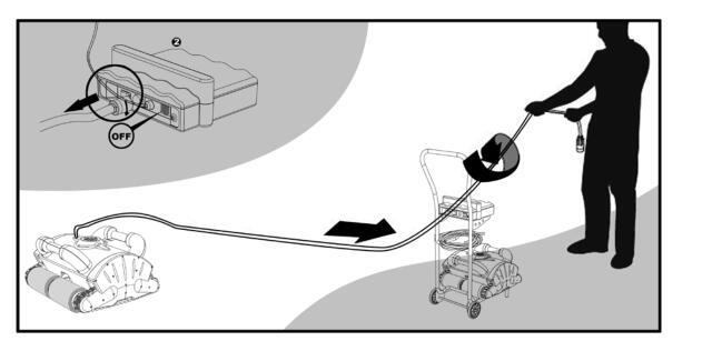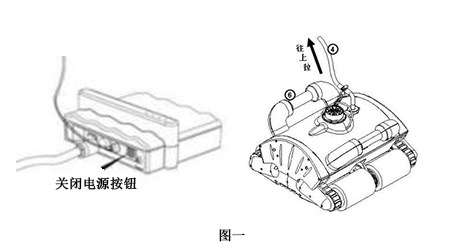 1.使用完海獅吸污機(jī)后,請務(wù)關(guān)閉機(jī)器。關(guān)閉電控盒的電源按鈕,慢慢拉動電纜直到把 手露出水面;手握把手將整個機(jī)器提出水面。(如圖一顯示)