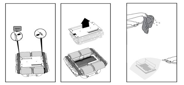 2.清洗吸污機(jī)。將機(jī)器輕輕倒置在平地上,推開過濾盒卡扣取出過濾盒,如圖 所示,然后沿邊緣將垃圾袋從底板卸下,將過濾袋取出洗干凈,并將過濾袋曬干后,重新裝回(如圖二顯示)。