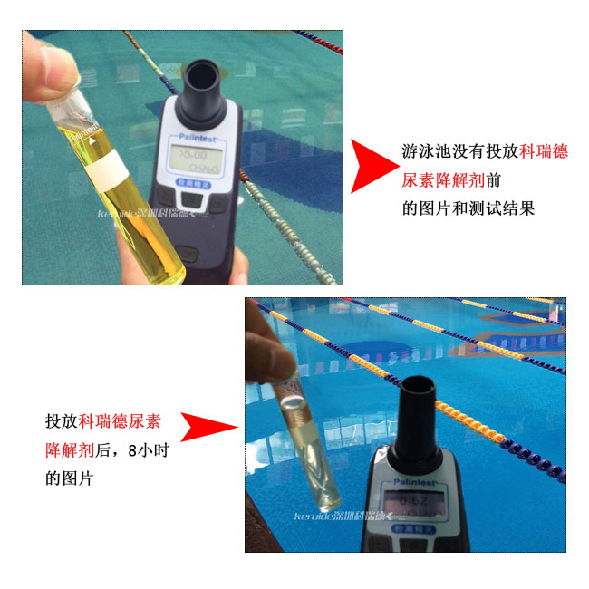 當(dāng)我們用尿素測(cè)試條測(cè)出游泳池尿素超標(biāo)的時(shí)候,我們可以用科瑞德尿素降解劑,這是一種無需換水去除尿素的方法,一般6-8小時(shí)可清除池水中的尿素!