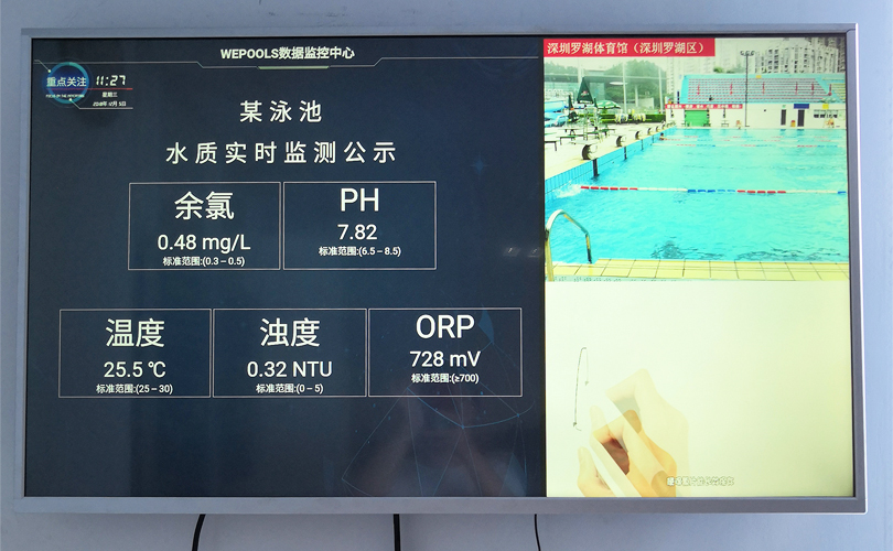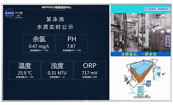 分屏設置我們可以利用公示屏給公眾展示游泳池設施及景點、宣傳等,使用這種水質(zhì)顯示屏可以達到多種效果,只要登入就可以顯示,右上角可以根據(jù)用戶需求來設計,游泳館視頻及日常水質(zhì)維護圖片等,非常實用。