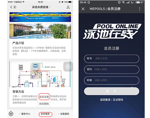 (1)關(guān)注公眾號(hào)后,點(diǎn)擊“會(huì)員服務(wù)”菜單欄中的會(huì)員注冊(cè),注冊(cè)用戶名登錄泳池在線監(jiān)測(cè)系統(tǒng)
