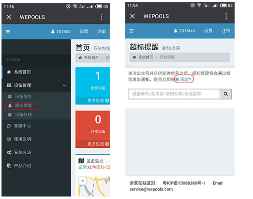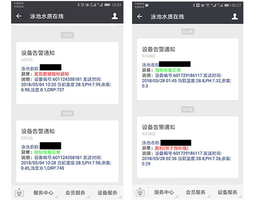 (4)添加手機(jī)信息提醒,如果泳池水質(zhì)超標(biāo)了,會(huì)收到超標(biāo)的信息以及恢復(fù)泳池水質(zhì)指標(biāo)的信息提醒。
