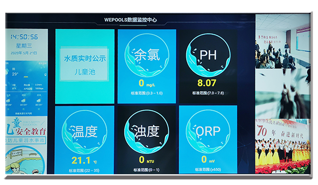 ????公示屏:水質(zhì)實時公示屏,在線監(jiān)測儀能連接到公示屏上,市民可以實時查看泳池溫度、pH、余氯等指標(biāo),公示屏有壁掛式和立式兩種,一般放在泳池旁或收銀大廳都可以。