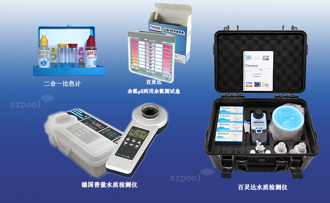 1.?使用水質(zhì)檢測工具,檢測一下池水的余氯和pH值。常見的檢測工具有余氯pH兩用測試盒,英國百靈達水質(zhì)檢測儀,德國普量水質(zhì)檢測儀。