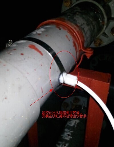 5、安裝細節(jié),如圖5,將從流量計接出來的回水軟管接回到管道中,接口的位置是沙缸后面的管道,一般接在離沙缸位置稍遠一點,以便有一定的壓力差。